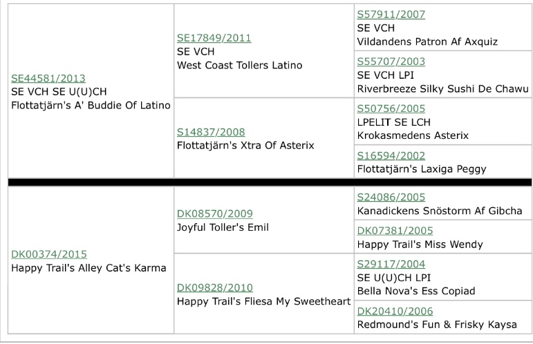Happy Trail’s First New Lexus (SE49317/2018), bor til dagligt i Vaggeryd i Sverige sammen med sin familie og hans far Buddie (Flottajärn’s A’ Buddie of Latino SE44581/2013). Buddie er svensk vildtspor champion samt udstillingschampion, dyrker schweiss spor sammen med sin ejer Thomas. Buddie er far til 6 kuld, i alt 36 hvalpe.