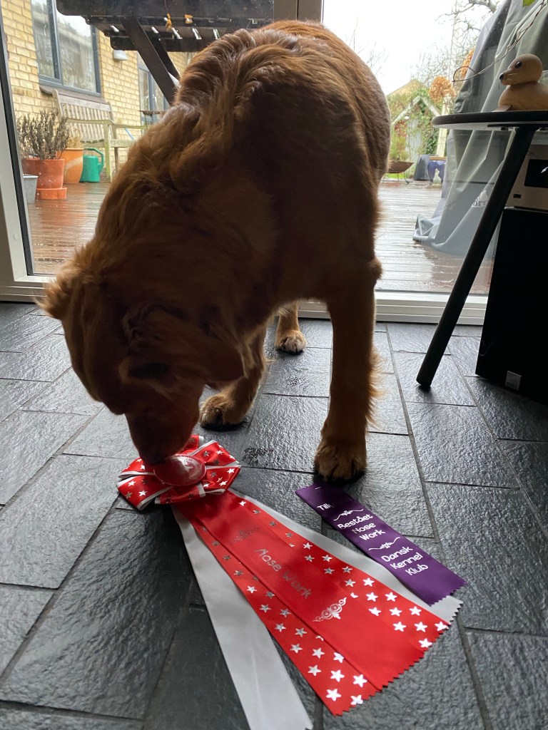 Vi har også gået til Nosework hos Kirsten ved Bagsværd Hundeskole. Jeg har altid trænet søg inden- og udendørs i haven med godbidder, men nu gør vi det mere målrettet på duft. Rita har en rigtig god næse, og på kort tid har hun fået styr på duften – lavendel. Nosework er en god måde at aktivere hende på, og det kræver ikke det helt store opsæt. Vi har deltaget på et par prøver i Danmark og Rita har også bestået duftprøve i Sverige, så hun kan deltage der.
