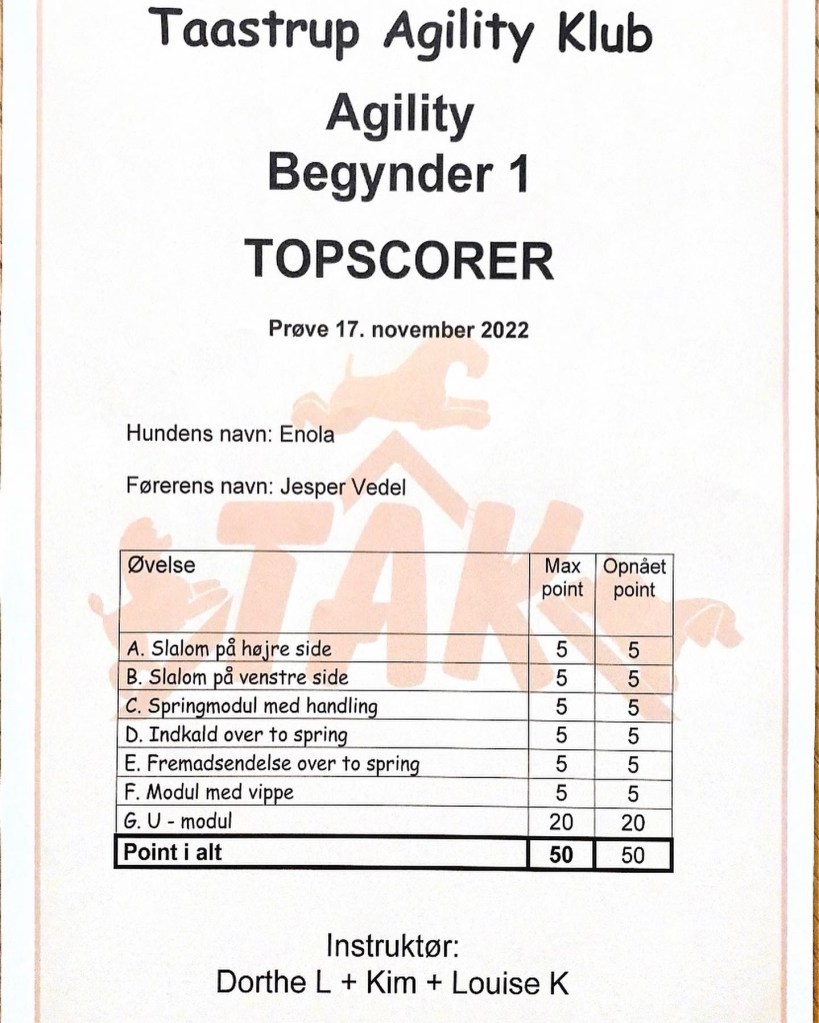 Sammen med sin hundefører (far) Jesper, går hun til agility i Taastrup agility klub. Her har Enola allerede vist stor interesse for opgaverne og er lærenem. Om hendes fysik kan man sige at, hun har en god accelleration og en god kondition, der gør at hun gerne udfordres. Det bliver spændende at følge deres agility forløb.